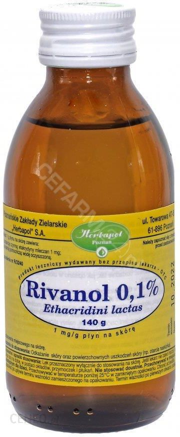 Skład: 100 g roztworu zawiera 100 mg mleczanu etakrydyny.. Wskazania: Zakażenia ropne skóry, błon śluzowych i ran (także trudno gojące się), stany zapalne zewnętrznych narządów moczowo-płciowych, zakażenia jamy ustnej, otarcia naskórka, oparzenia, owrzodzenia. Rivanol stosowany jest w zakażeniach ropnych skóry, błon śluzowych i ran (także trudno gojące się), w stanach zapalnych zewnętrznych narządów moczowo-płciowych, zakażeniach jamy ustnej, otarciach naskórka, oparzeniach oraz owrzodzeni.. Działanie: Preparat do stosowania miejscowego, pochodna akrydyny o działaniu przeciwbakteryjnym, szczególnie wobec bakterii Gram-dodatnich i przeciwpierwotniakowym. Uszkadza enzymy i bezpośrednio hamuje syntezę białek drobnoustrojów. Działa nie tylko na powierzchni skóry, ale również penetruje do sąsiednich tkanek. Nie działa drażniąco na skórę i błony śluzowe i nie powoduje powstawania oporności.. Przeciwwskazania: Ze względu na ryzyko inaktywacji nie stosować ze środkami o działaniu utleniającym (nadmanganian potasu, nadtlenek wodoru), garbnikami (tanina), substancjami o charakterze anionowym (glikol polietylenowy) oraz z roztworem boranu sodu, kwasu salicylowego, chlorku sodu..