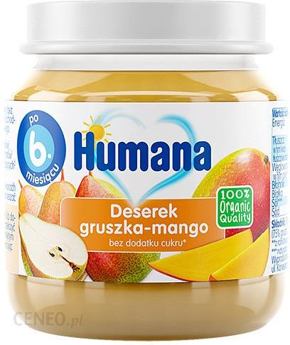W skład deserku Humana 100% Organic Quality Gruszka-Mango wchodzą jedynie soczyste, dojrzewające w pełnym słońcu gruszki oraz egzotyczne i soczyste mango. Deserek szczyci się słodkim smakiem, który zawdzięcza zawartym owocom, bez dodatku cukru, na dodatek ma delikatną konsystencją. Humana 100% Organic Quality Gruszka deserek dla niemowląt od 4 miesiąca poddawany jest rygorystycznym normom jakościowym, dzięki czemu jest gwarancja, że dziecko je tylko to, co najlepsze.Produkt Humana 100% Organic Quality dzięki zawartym w składzie wartościowym substancjom odżywczym stanowią doskonałe uzupełnienie posiłków i mogą być wprowadzane jako pierwsze produkty rozszerzające dietę dziecka.Zastosowanie: dla niemowląt po 6. miesiącu życia.Sposób użycia: zaplanowaną porcję pokarmu należy przełożyć do miseczki. Pozostałą niewykorzystaną część pokarmu zaleca się przechowywać w zamkniętym słoiczku w lodówce do 48 godzin. Wyjmując produkt ze słoiczka, używaj plastikowej łyżeczki.Skład: 100% owoców ** (75% gruszki, 25% mango)**z kontrolowanych upraw ekologicznych100g produktu zawiera:- wartość energetyczna: 259kJ/61kcal,- tłuszcz 0,3g, w tym kwasy tłuszczone nasycone 0,1g, węglowodany 12,4g, w tym cukry 10,8g, błonnik90g, białko 0,5g, sól 0,001g, sód 0,001g, sód 3mg.Ważne informacje:W 100% organiczny.Nie zawiera składników pochodzących z mleka krowiego.Bez dodatku: cukru (sacharozy) (zawiera jedynie cukry naturalnie występujące w owocach), dodatków zapachowych, barwników, konserwantów i substancji zagęszczających.Nie używaj, jeśli wieczko się ugina. Bezpieczne zamknięcie próżniowe „klika” przy pierwszym otwarciu.Przechowywać w suchym i chłodnym miejscu.Masa netto: 125gWyprodukowano w UE dla:Humana Poland Sp. z o.o.ul. Chłodna 5100-867 WarszawaRegulamin konkursu „Humana Naturalnie” znajdziesztutaj