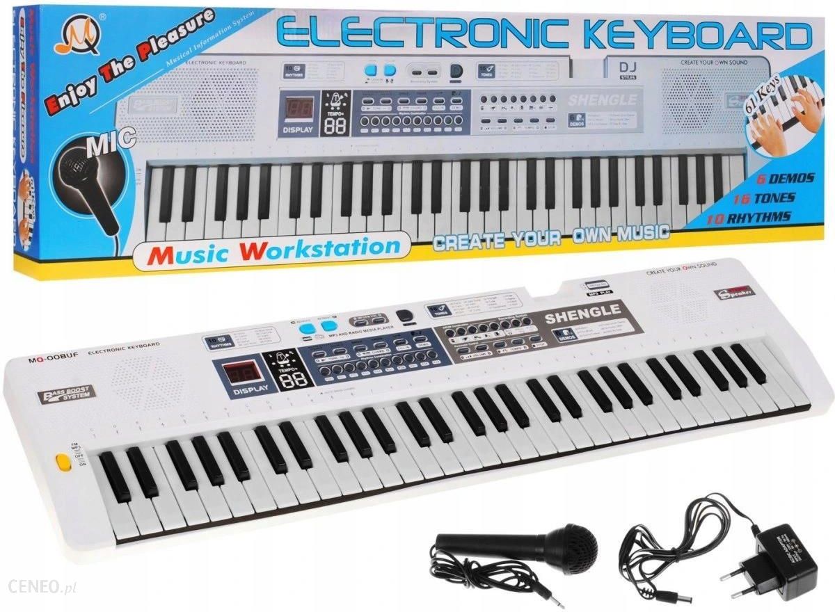 Opis Fantastyczny KEYBOARD + mikrofon + zasilacz + USB + radio – 61 klawiszy [ZMU.MQ-008UF]- przycisk zasilania on/off,- klawiatura muzyczna (36 klawiszy białych + 25 klawiszy czarnych),- cyfrowy wyświetlacz,- przyciski uruchamiające 16 tonów (np. piano, wiolonczela, gitara jazzowa, trąbka, saksofon, flet, obój…),- przyciski uruchamiające 10 rytmów (np. walc, tango, ballada, disco, country, rumba…),- przyciski uruchamiające 5 rodzajów bębnów,- przycisk radio oraz przycisk uruchamiający wyszukiwanie stacji radiowych,- przyciski regulacji głośności,- przyciski regulacji tempa,- przycisk start/stop,- przycisk nagrywanie,- przycisk PLAY,- wyjście na mikrofon,- wejście na słuchawki,- wejście MP3,- wejście USB,- 2 głośniki,- zasilacz.Zasilaniewymiennie:1. przez sieć – zasilacz prądowy dołączony do keyboardu,2. sześć baterii typu AA 1,5V (zwykłe paluszki) – brak w zestawie.Wymiary- długość ok. 76 cm,- szerokość ok. 20,5 cm,- wysokość ok. 6 cm.