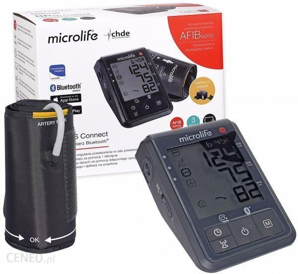Microlife BP B6 Connect z zasilaczem sieciowym Wysokiej klasy ciśnieniomierz wykrywający migotanie przedsionków i arytmię. Z technologią MAM(trzy automatyczne pomiary) i Bluetooth. BP B6 Connect to najnowocześniejszy wyrafinowany sprzęt, który oferuje bardzo dużo funkcji: Wykrywa migotanie przedsionków z dużą dokładnością i pokazuje strzałkę po każdym pomiarze. Ta strzałka wskazuje pozycję ostatniego pomiaru w porównaniu do średniej z poprzednich pomiarów ciśnienia krwi. Wszystkie odczyty mogą być wszechstronnie przeanalizowane za pomocą aplikacji Microlife Connected Health + na smartfonie lub za pomocą oprogramowania BP Analyzer na PC. Wykrywa arytmię pulsu w celu wczesnego ostrzegania o możliwej arytmii serca 7-dniowa średnia, według międzynarodowych wytycznych dotyczących nadciśnienia Jest kompaktowym przenośnym urządzeniem z technologią Gentle+ wyposażonym w perforowany mankiet pasujący do ramienia o obwodzie od 22 cm do 42 cm pozwalający korzystać z ciśnieniomierza niemal każdemu. Technologia Gentle+ kontroluje ciśnienie powietrza w mankiecie podczas dokonywania pomiaru. Urządzenie ponadto sygnalizuje użytkownikowi, kiedy mankiet jest założony niepoprawnie. Po pomiarze urządzenie wyświetla wynik wraz z pozycjonowaniem wg wskaźnika ryzyka WHO. Przyrząd umożliwia wybór standardowego (pojedynczy pomiar) lub tryb MAM (trzy automatyczne pomiary- najbardziej zalecany). W tym trybie wykonywane są 3 następujące po sobie pomiary, a ich wynik jest następnie analizowany i wyświetlany. Ze względu na ciągłe wahania ciśnienia uzyskany w ten sposób wynik jest bardziej wiarygodny niż wynik pojedynczego pomiaru. Cechy produktu: System PAD – wykrywanie arytmii AFIB sens – wykrywanie migotania przedsionków Mankiet perforowany M-L (22 – 42 cm) Bluetooth SMART System Gentle+, optymalne tempo pompowania dobór ciśnienia w mankiecie Testowany klinicznie Pomiar ciśnienia krwi i pulsu Klasyfikacja ryzyka wg WHO Funkcja MAM, średni wynik z 3 pomiarów Wskaźnik poprawności założenia mankietu Pamięć 2 użytkowników z pamięcią 99 ostatnich pomiarów dla każdego użytkownika Wskaźnik ruchu ramienia MyBP – diagnostyka 7-dniowa Praktyczny uchwyt na mankiet. W zestawie zasilacz sieciowy do ciśnieniomierzy Microlife Zasilacz jest alternatywą dla baterii, które przy częstym użytkowaniu trzeba wymieniać Dane techniczne: Zakres pomiaru: 20 – 280 mmHg – ciśnienie krwi, 40 – 200 uderzeń na minutę– tętno Dokładność statyczna: ciśnienie w zakresie ± 3 mmHg Dokładność pomiaru tętna: ±5 % wartości odczytu Temperatura robocza: 10 – 40 ˚C / 50 – 104 ˚F Maksymalna wilgotność względna 15-95 % Temperatura przechowywania: -20 – +55 ˚C / -4 – +131 ˚F Maksymalna wilgotność względna 15-95 % Waga: 415 g (z bateriami) Wymiary: 157,5 x 105 x 61,5 mm Sposób pomiaru: oscylometryczny, odpowiadający metodzie Korotkoffa: faza I skurczowa, faza V rozkurczowa Źródło napięcia: 4 baterie AA 1,5 V, Zasilacz 6 V DC; 600 mA (w zestawie) Żywotność baterii: około 920 pomiarów (nowe baterie) W zestawie: Ciśnieniomierz automatyczny BP B6 Connect Mankiet rozmiar M/L (22-42 cm) Uchwyt do mocowania mankietu. Kabel USB. Komplet baterii Poręczne etui do przechowywania urządzenia. Polska instrukcja obsługi. Zasilacz sieciowy