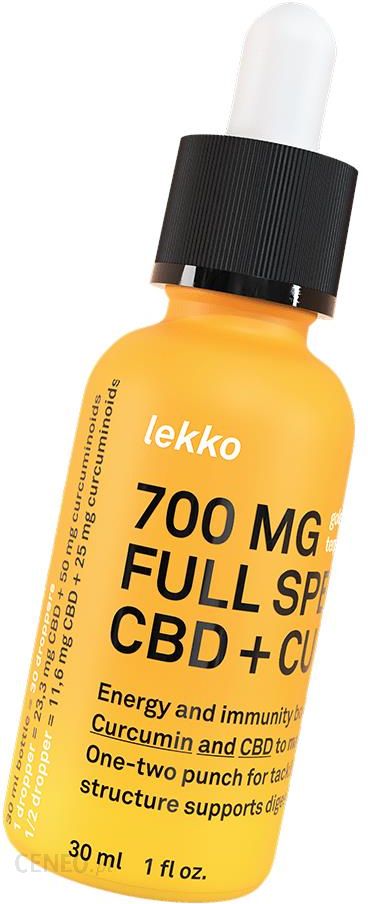 Podwójna odporność od CBD i kurkuminu!Olejek konopny CBD 700MG + kurkuma LEKKO CBD to duże opakowanie pełne CBD, ale i innych kannabinoidów takich jak: CBDA, CBC, CBGA, CBG, CBDV, CBN. Olejek w swoim składzie nie zawiera THC dzięki czemu może być stosowany np. przez sportowców.Zastosowaniaregulacja poziomu cholesterolu,regulacja poziomu hormonów,przyspiesza gojenie ran,odżywia skórę, włosy i paznokcie,poprawia pracę układu pokarmowego,ułatwia zasypianie,działa odstresowująco DawkowanieZalecana dzienna porcja 1ml. 1-2 razy dziennie. Preparat należy przyjmować doustnie pod język, trzymać przez 60 sekund a następnie połknąć.1 ml zawiera: Cannabia Sativa L: 23,3 mg, Kurkumina: 50 mg MCT: 926,7 mgPrzeciwskazaniaOlejek konopny CBD to suplement diety, którego stosowanie warto skonsultować z specjalistą. Kannabidiol może wchodzić w niepożądane reakcje z przyjmowanymi lekami bądź nie być właściwie przyswajanym przez nasz organizm.Po CBD nie wolno sięgać bez konsultacji z lekarzem, jeśli przyjmujemy leki immunosupresyjne, chemioterapeutyki, antydepresanty, inhibitory pompy protonowej, klopidogrel, warfarynę, montelukast, naproksen, leki przeciwspsychotyczne, opioidy, benzodiazepiny, statyny oraz blokery kanału wapniowego.Należy spożyć do: 12/2023