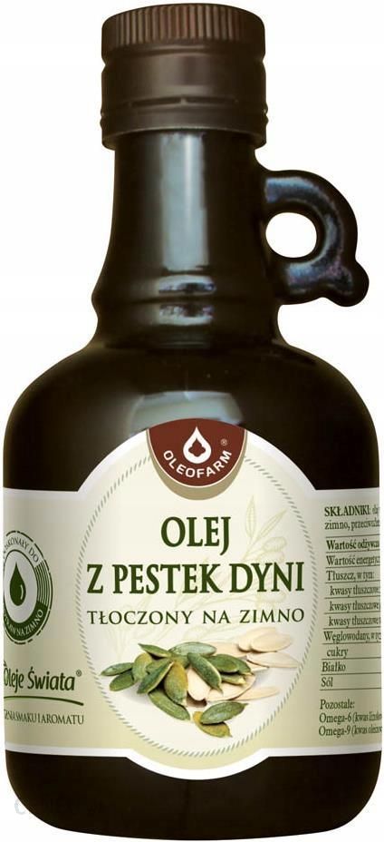 Opis produktu Opis Olej z pestek dyni to tłuszcz, mający wpływ na nasze zdrowie. Posiada on szereg właściwości zdrowotnych. Szczególne zastosowanie oleju z pestek dyni dotyczy profilaktyki pasożytniczej, wspomagania leczenia schorzeń gruczołu krokowego i układu moczowego. Olej z pestek dyni można spożywać bezpośrednio lub dodawać do potraw zimnych (niezalecany do dań gorących poprzez utratę w wysokiej temperaturze swoich właściwości). Olej dyniowy sprawdzi się również doskonale w codziennej pielęgnacji skóry! Oferowany olej z pestek dyni jest nierafinowany, w jego skład wchodzą głównie nienasycone kwasy tłuszczowe. To bogate źródło kwasu omega-6 i omega-9. Ponadto olej z dyni posiada fitosterole, witaminy, mikro i makroelementy, kukurbitacyna i skwalen. Olej z pestek dyni dzięki zawartości alkanoidu kukurbitacyny, który paraliżuje układ nerwowy pasożytów, co sprawia, że z powodzeniem może być stosowany przeciwpasożytniczo. Należy wiedzieć, iż olej z pestek dyni zawiera substancje, witaminy i kwasy tłuszczowe, które mają zastosowanie w kosmetyce. Wzmacniają włosy, zapobiegają nadmiernemu wypadaniu włosów u mężczyzn, ponadto spożywanie produktu wpływa na szybszy wzrost i połysk włosów. Olej stosować można także bezpośrednio na włosy i ciało bezpośrednio lub jako składnik domowych kosmetyków. Ten nieoceniony produkt tłoczony z pestek dyni wpływa korzystnie na układ nerwowy, między innymi przy regularnym stosowaniu można zaobserwować zmniejszenie niepokoju i stanów lękowych. Pomaga zasnąć i poprawia ogólne samopoczucie. Oleje z pestek dyni spożywać mogą zarówno dorośli, jak i dzieci (najmłodszym zaleca się jedną łyżeczkę dziennie). Ze względu na wyjątkowy smak olej ten możemy z powodzeniem stosować w codziennej diecie jako dodatek do sałatek, surówek, zup i innych potraw przygotowywanych na zimno i na gorąco. Nie jest polecany do smażenia, gdyż wysoka temperatura niszczy zdrowotne substancje, które posiada. Jest to produkt najwyższej jakości, wyróżniający się ciemną barwą, charakterystycznym orzechowym smakiem oraz zapachem. Pojemność netto: 250ml Składniki Olej z pestek dyni tłoczony na zimno, przeciwutleniacz: mieszanina tokoferoli Wartość odżywcza Wartości odżywcze w 100g Wartość energetyczna 3389 kJ / 824 kcal Tłuszcz 91,6 g w tym kwasy tłuszczowe nasycone 17,1 g w tym kwasy tłuszczowe jednonienasycone 30.7 g w tym kwasy tłuszczowe wielonienasycone 43,8 g Węglowodany 0 g w tym cukry 0 g Białko 0 g Sól 0 g Omega-6 (kwas linolowy) 43,4 g Omega-9 (kwas oleinowy) 29,9 g Sposób użycia Olej powinno się spożywać na zimno np. jako dodatek do sałatek, surówek, sosów czy dipów. Informacja alergenna Brak Zalecane warunki przechowywania Przechowywać w temperaturze pokojowej. Uwagi Może wytrącić się naturalny osad. Szczegóły produktu Parametr Informacja Kraj Producenta Polska Wegetariański Tak Wegański Tak